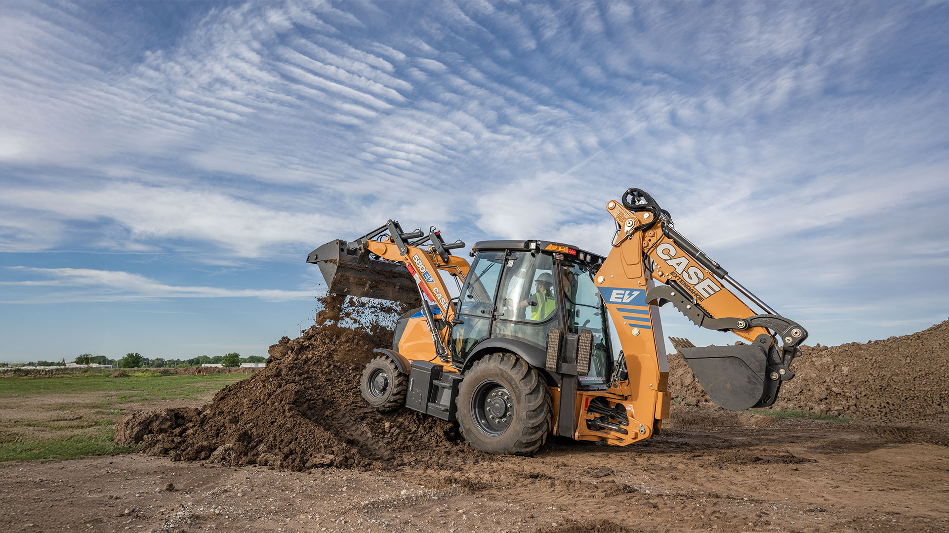 CASE 580EV Electric Backhoe Loader lifting dirt with bucket onto dirt pile under a blue sky