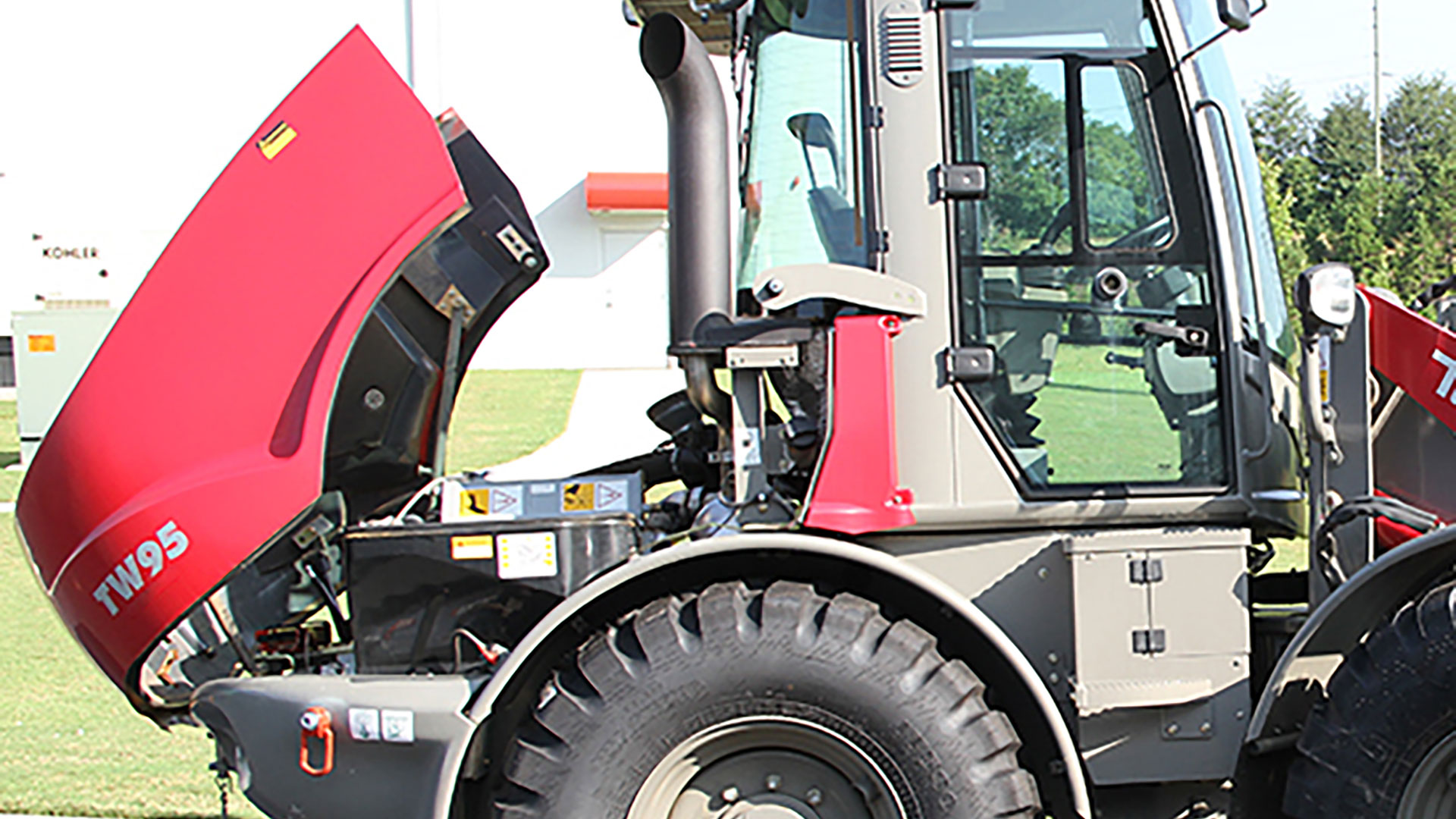 The TW95 is powered by a 114 hp, Deutz TCD 3.6 L4 engine that is Final Tier 4 using an SCR and DOC exhaust after treatment system. The hydrostatic drive is responsive and delivers excellent power for loading applications, and it also provides dynamic braking, slowing the loader as the operator backs off the throttle. High-speed road gear is standard equipment and enables the loader to travel at speeds up to 24.8 mph for greater mobility and versatility. 100% locking differentials can be engaged at low speeds to provide maximum tractive effort in the most demanding conditions. Maintenance and inspections are simple to perform on the TW95 due to the wide opening engine hood that provides access to key daily inspection points.