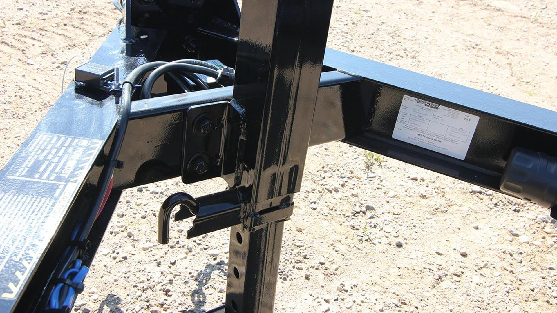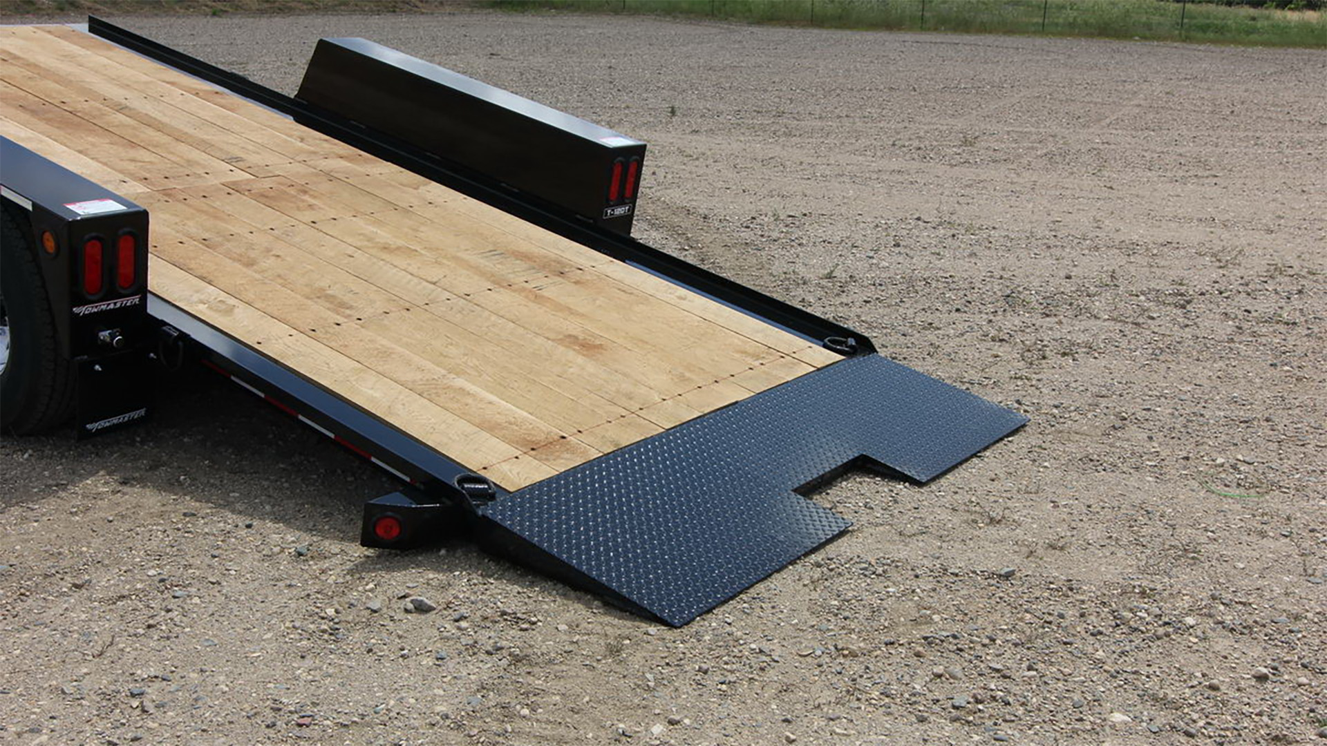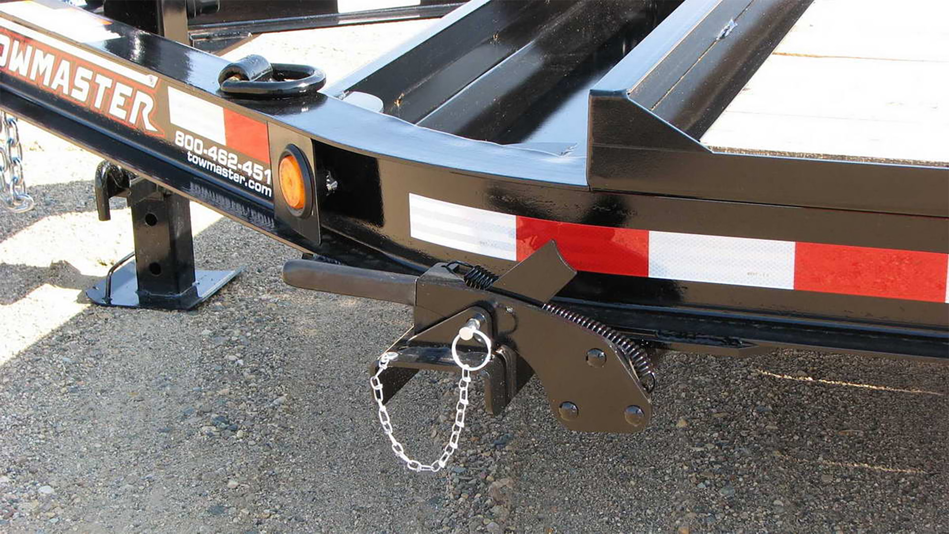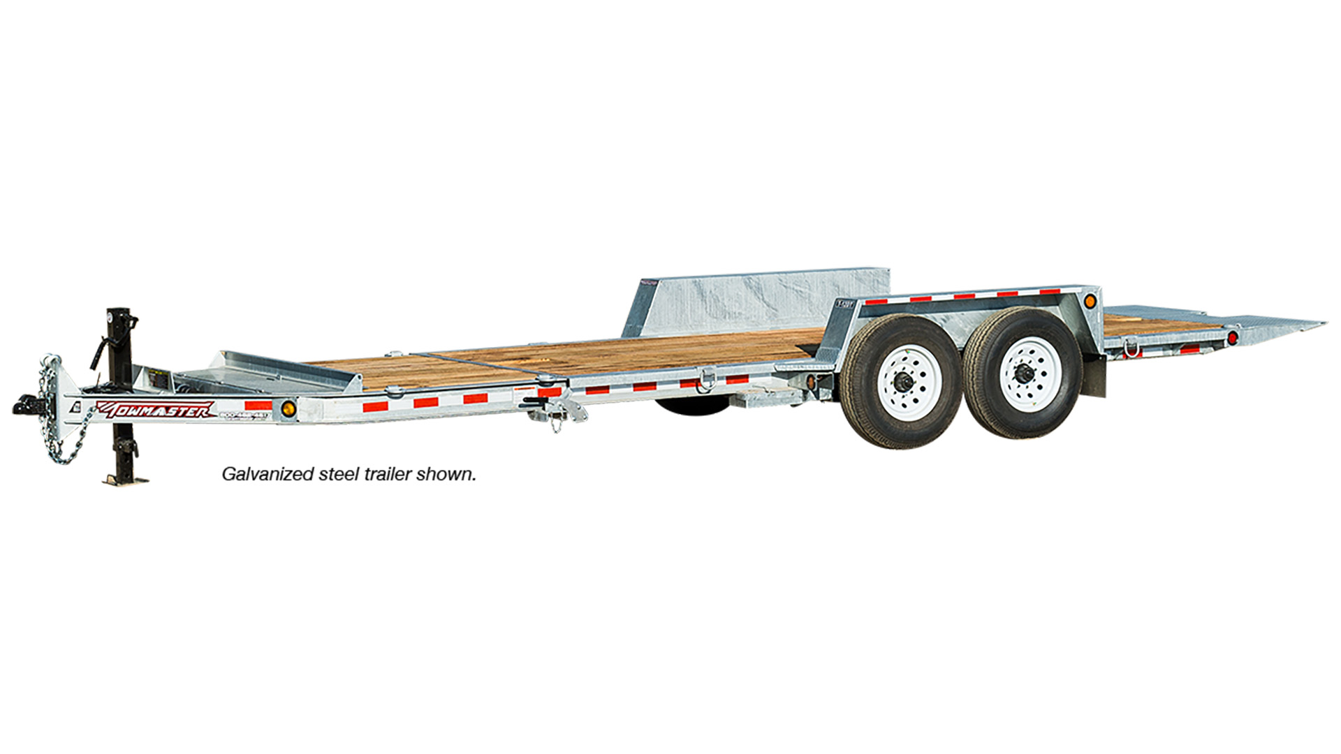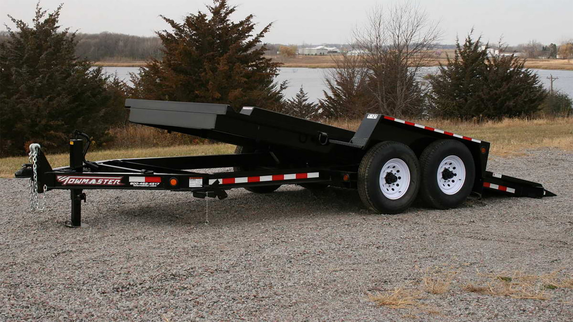 The Towmaster® drop-deck tilt trailers are popular with rental dealers and small contractors. There are no ramps to hassle with; simply tilt the deck and drive on or off. This trailer is built on our cold-formed I-beam tongue and main frame for tough durability. The tilt deck trailer features a single lever twin-latch system, knife-edge approach plate, rubber-ride axles and adjustable hitch. A deck cushion cylinder eases the deck back into transport position and prevents equipment from slamming the deck down.