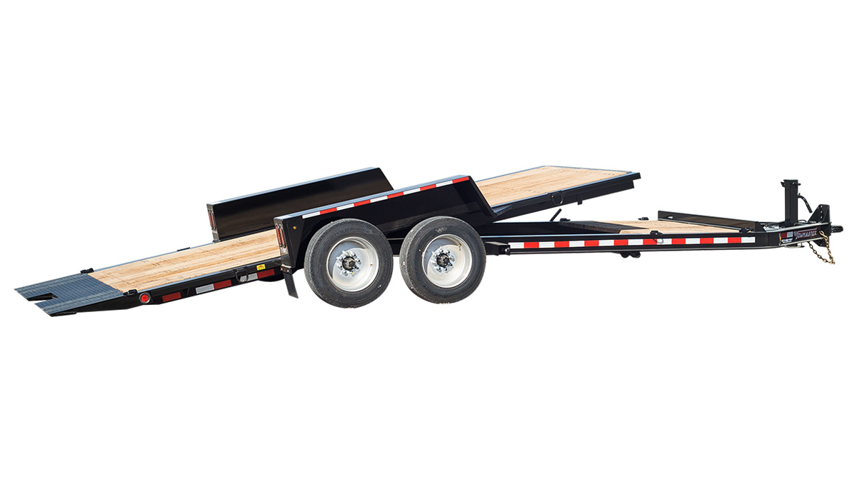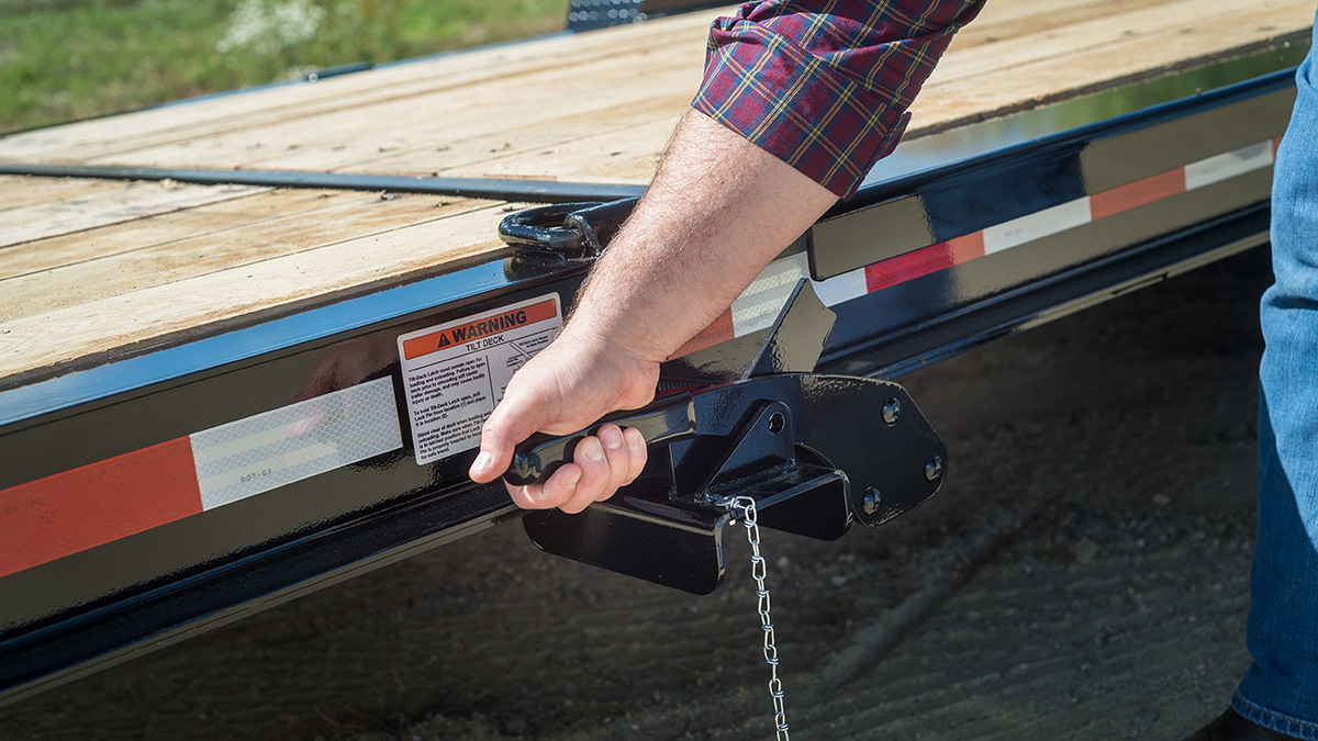 The Towmaster® drop-deck tilt trailers are popular with rental dealers and small contractors. There are no ramps to hassle with; simply tilt the deck and drive on or off. This trailer is built on our cold-formed I-beam tongue and main frame for tough durability. The tilt deck trailer features a single lever twin-latch system, knife-edge approach plate, rubber-ride axles and adjustable hitch. A deck cushion cylinder eases the deck back into transport position and prevents equipment from slamming the deck down.